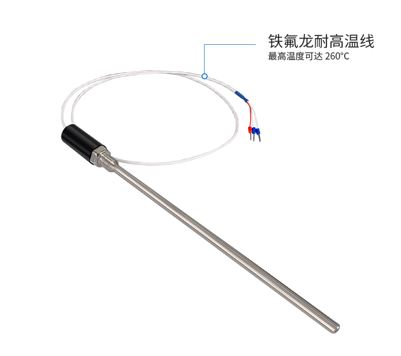 本产品参数如下:德国贺利氏进口高精度PT100铂热电阻温度传感器,精度:1/3B级,测温范围:-50~100℃,304材料,探头尺寸:10*50mm,活动螺纹为M20*1.5,延长线为三线镀银特氟龙屏蔽线线长1米,尾部3P端子